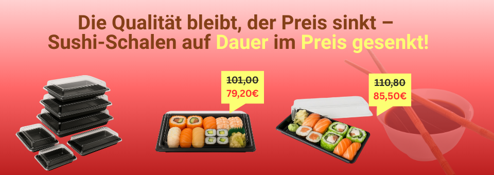 Sushi ist ein beliebtes To-go-Essen. Damit es präsentabel aussieht, ist der Kontrast zwischen dem weißen Reis und den schwarzen Schalen gängig. In unsere flachen Schalen passt eine Vielzahl von Sushi und die klaren Deckel erlauben einen freien Blick auf die Speisen. Für ein authentisches Gefühl beim Essen stehen außerdem Stäbchen in unserem Sortiment zur Verfügung.