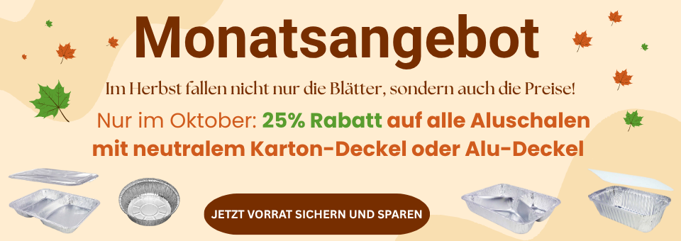 Sie finden in unserem Shop eine große Auswahl an Verpackungslösungen und passendem Zubehör für die unterschiedlichsten Gelegenheiten. Sei es für Veranstaltungen wie Messen, den lokalen Betrieb oder das Ausliefern von Gerichten. Zu unserem Sortiment gehören Behälter zur Aufbewahrung von Speisen und Getränken verschiedener Art. Unter den Außer-Haus-Verpackungen gibt es allerlei Produkte, um Ihr Angebot für den Transport vorzubereiten. Lunchboxen, Siegelschalen, Aluschalen, Suppenbehälter und Servierplatten stellen nur einen Teil dessen dar. Weiterhin führen wir Imbissartikel wie Einweggeschirr und -besteck, Trink- und Eisbecher, Tragetaschen und vieles mehr. Hervorzuheben sind unsere wieder verwendbaren und somit umweltschonenden Mehrweg-Verpackungen.